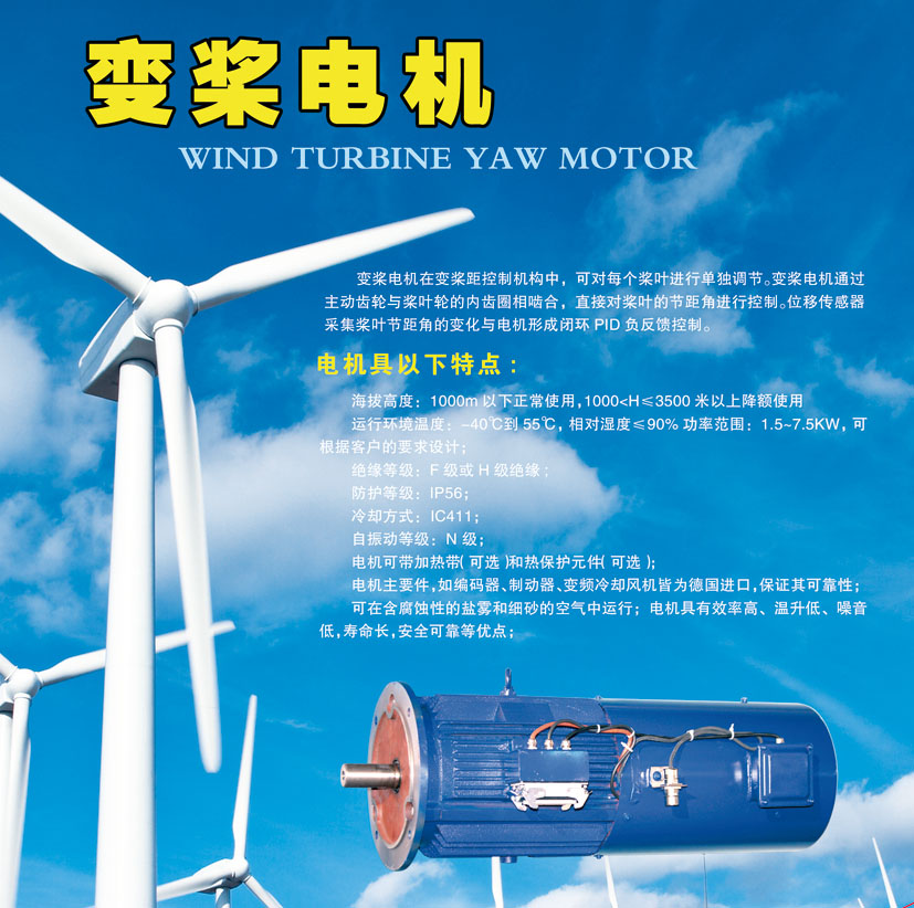 - 變槳電機在變槳距控制機構中,可對每個槳葉進行單獨調節。變槳電機通過主動齒輪與槳葉輪的內齒圈相嚙合,直接對槳葉的節距角進行控制。位移傳感器采集槳葉節距角的變化與電機形成閉環PID負反饋控制。特點:海拔高度:1000米以下正常使用,1000<H<3500米以上降額使用;運行環境溫度:-40到55,相對濕度<90%;功率范圍:1.5~7.5KW,可根據客戶的要求設計;絕緣等級:F級或H級絕緣;防護等級:IP56;冷卻方式:IC411;自振動等級:N級;電機可帶加熱帶(可選)和熱保護元件(可選);電機主要件,如編碼器、制動器、變頻冷卻風機皆為德國進口,保證其可靠性;可在含腐蝕性的鹽霧和細砂的空氣中運行;電機具有效率高、溫升低、噪音低、壽命長、案例可靠等優點。變槳電機在變槳距控制機構中,可對每個槳葉進行單獨調節。變槳電機通過主動齒輪與槳葉輪的內齒圈相嚙合,直接對槳葉的節距角進行控制。位移傳感器采集槳葉節距角的變化與電機形成閉環PID負反饋控制。特點:海拔高度:1000米以下正常使用,1000<H<3500米以上降額使用;運行環境溫度:-40到55,相對濕度<90%;功率范圍:1.5~7.5KW,可根據客戶的要求設計;絕緣等級:F級或H級絕緣;防護等級:IP56;冷卻方式:IC411;自振動等級:N級;電機可帶加熱帶(可選)和熱保護元件(可選);電機主要件,如編碼器、制動器、變頻冷卻風機皆為德國進口,保證其可靠性;可在含腐蝕性的鹽霧和細砂的空氣中運行;電機具有效率高、溫升低、噪音低、壽命長、案例可靠等優點。變槳電機在變槳距控制機構中,可對每個槳葉進行單獨調節。通過主動齒輪與槳葉輪的內齒圈相嚙合,直接對槳葉的節距角進行控制。位移傳感器采集槳葉節距角的變化與電機形成閉環PID負反饋控制。 特點:海拔高度:1000米以下正常使用,1000<H≤3500米以上降額使用;運行環境溫度:-40℃到55℃,相對濕度≤90%;功率范圍:1.5~7.5KW,可根據客戶的要求設計;絕緣等級:F級或H級絕緣;防護等級:IP56;冷卻方式:IC411;自振動等級:N級;電機可帶加熱帶(可選)和熱保護元件(可選);電機主要件,如編碼器、制動器、變頻冷卻風機皆為德國進口,保證其可靠性;可在含腐蝕性的鹽霧和細砂的空氣中運行;電機具有效率高、溫升低、噪音低、壽命長、安全可靠等優點。